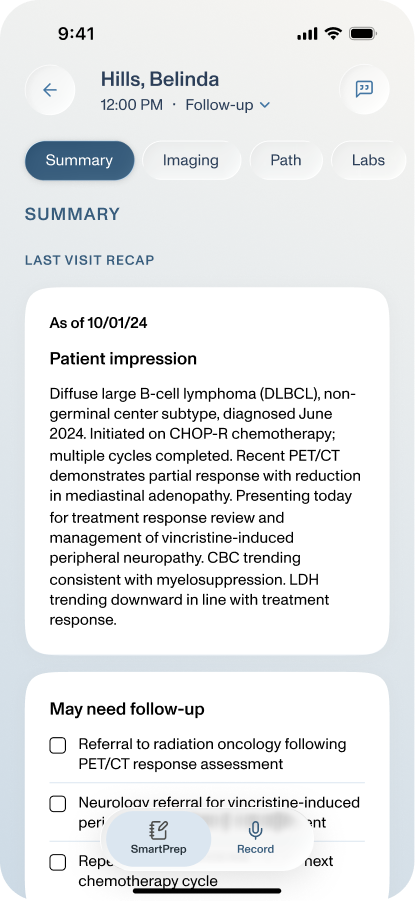 In specialty care, a single patient chart can contain dozens of documents. SmartPrep synthesizes it all and surfaces what’s relevant to today’s visit.
